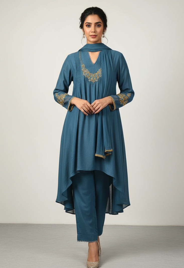 Elevate your style with the blue colour designer 2 piece suit with dupatta, available in elegant shades of blue. Crafted from luxurious silk fabric, this set offers a smooth and lustrous finish that adds a touch of sophistication to any occasion. The sleek design ensures both comfort and style, making it perfect for festive events, semi-formal gatherings, or evening outings. The UV0651 heavy suit combines modern elegance with timeless beauty, offering you a refined and chic look for any special occasion.