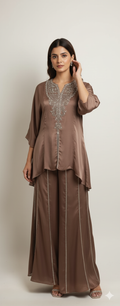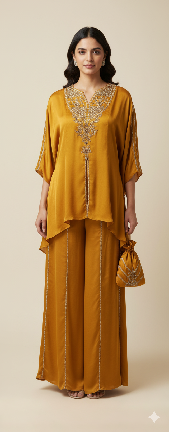 Exude grace and luxury with the UV0390 3PCS Flared Sharara Set, available in stunning shades of Ivory, Mouse, Mustard, and Strawberry. Crafted from premium Satin GGT fabric, this set offers a smooth, lustrous finish that enhances its flared silhouette. The rich colors and soft texture make it a perfect choice for weddings, receptions, or festive events. The UV0390 Flared Sharara Set combines elegance with modern design, making it an essential piece for those seeking timeless beauty and sophistication.