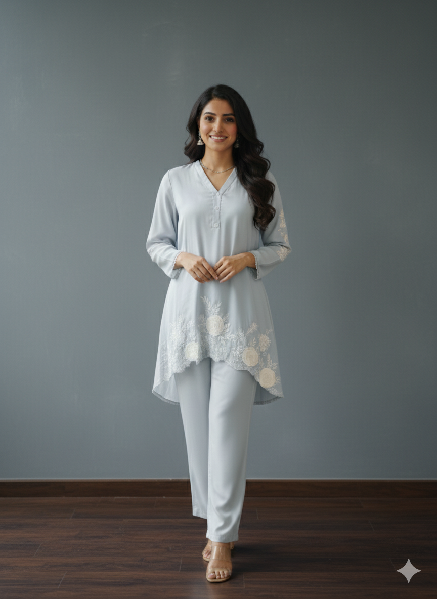 Elevate your ethnic wardrobe with this stunning Floral Embroidered Georgette Tunic Set, designed for effortless grace and timeless style. Crafted from lightweight and flowy georgette fabric, this tunic set offers a flattering silhouette that moves beautifully with every step.