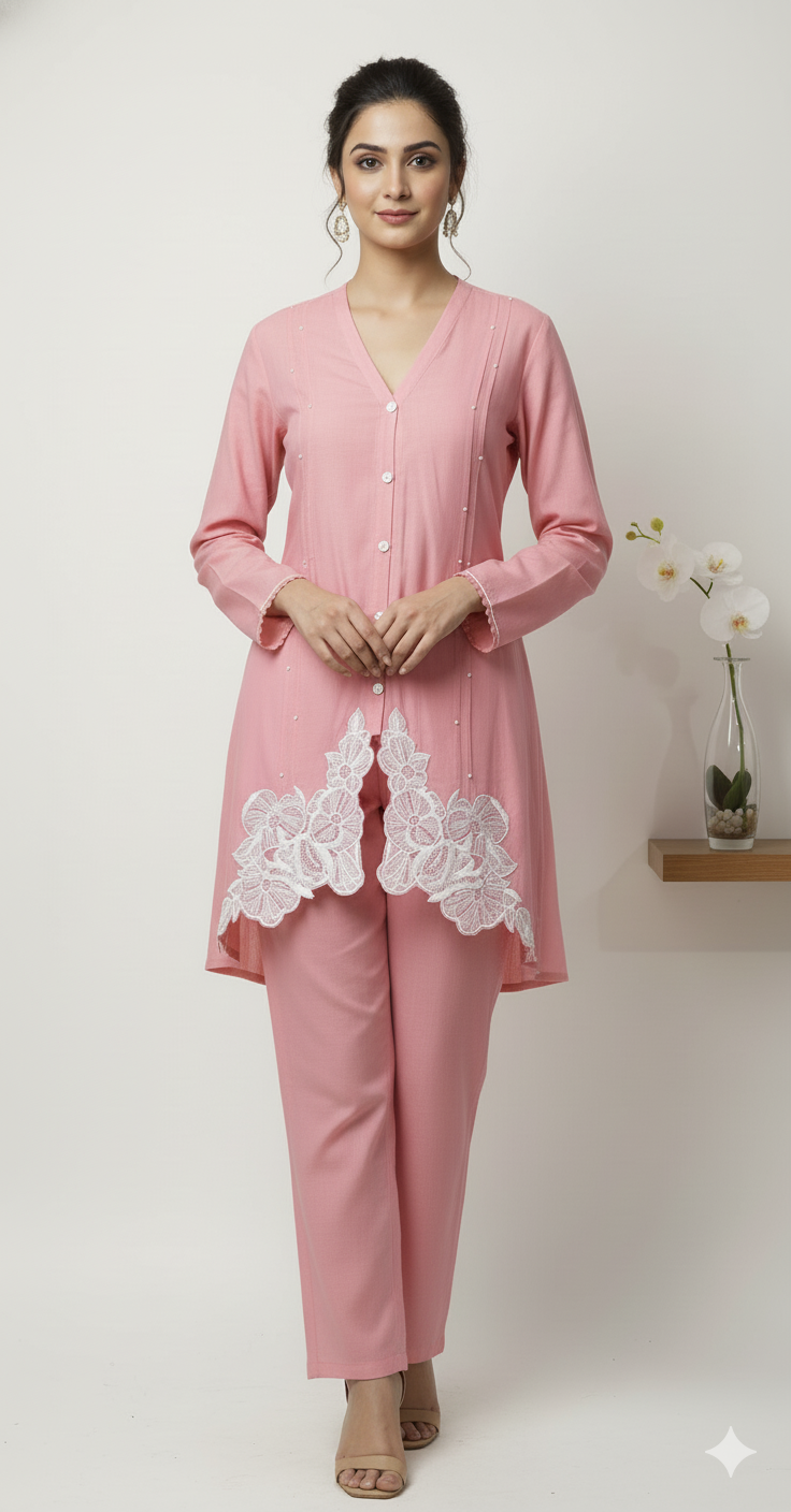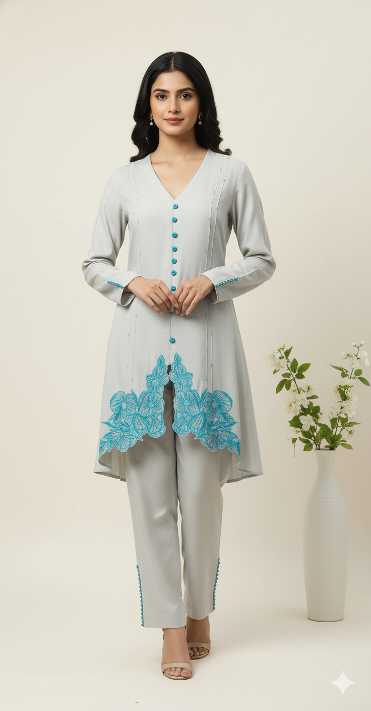 SAGE GREEN CORD-SET WITH WHITE PEARL & THREAD EMBROIDERY DETAILS