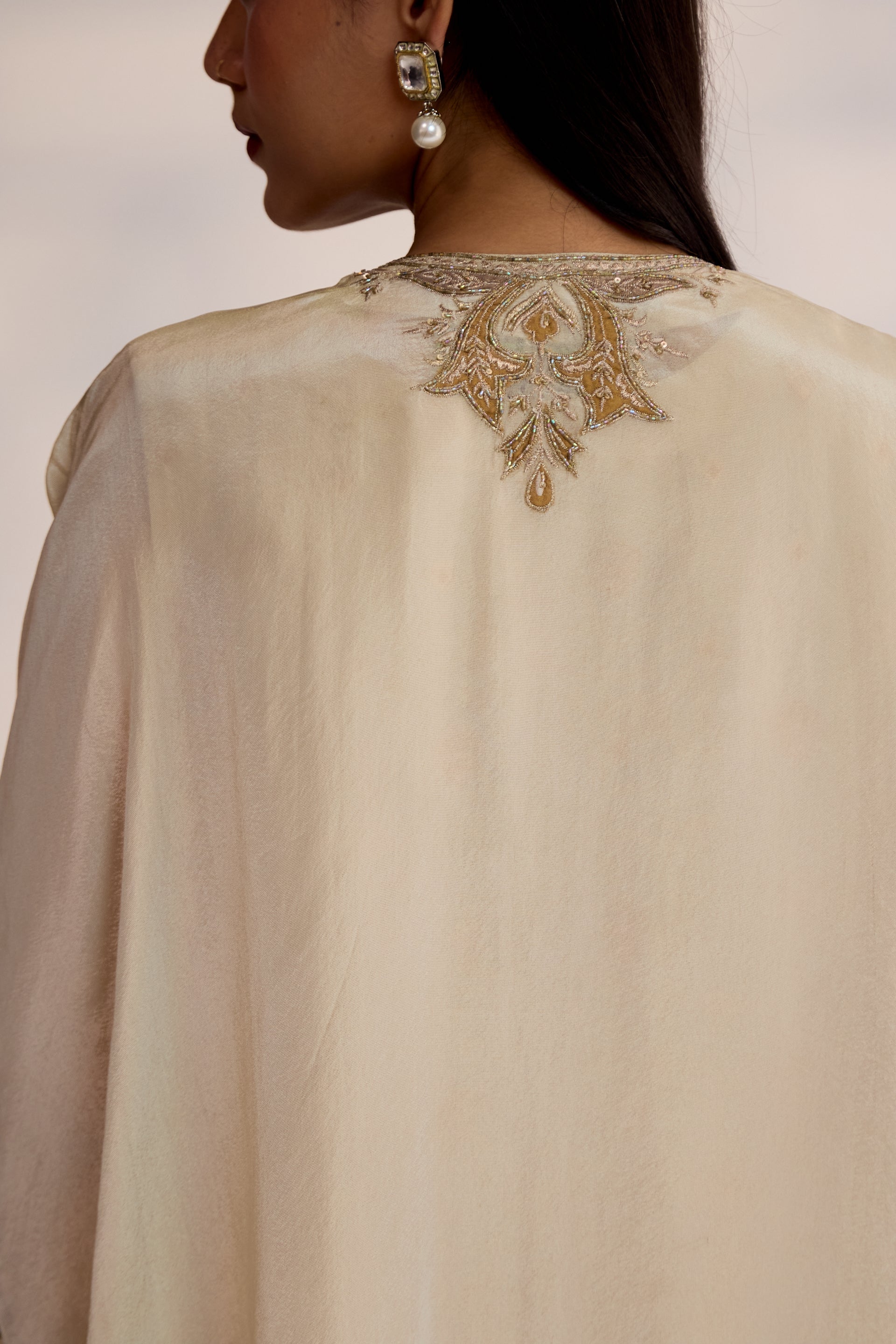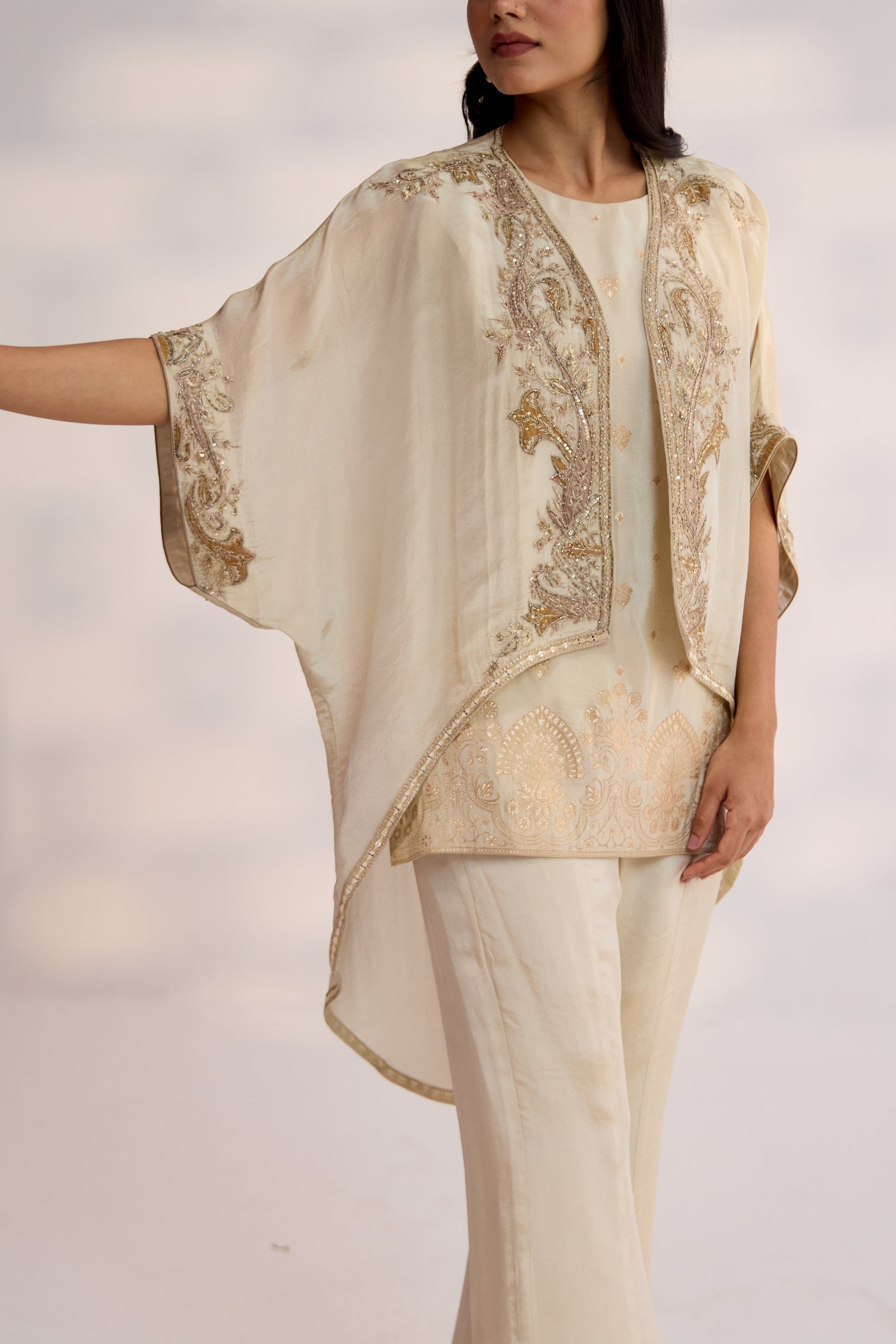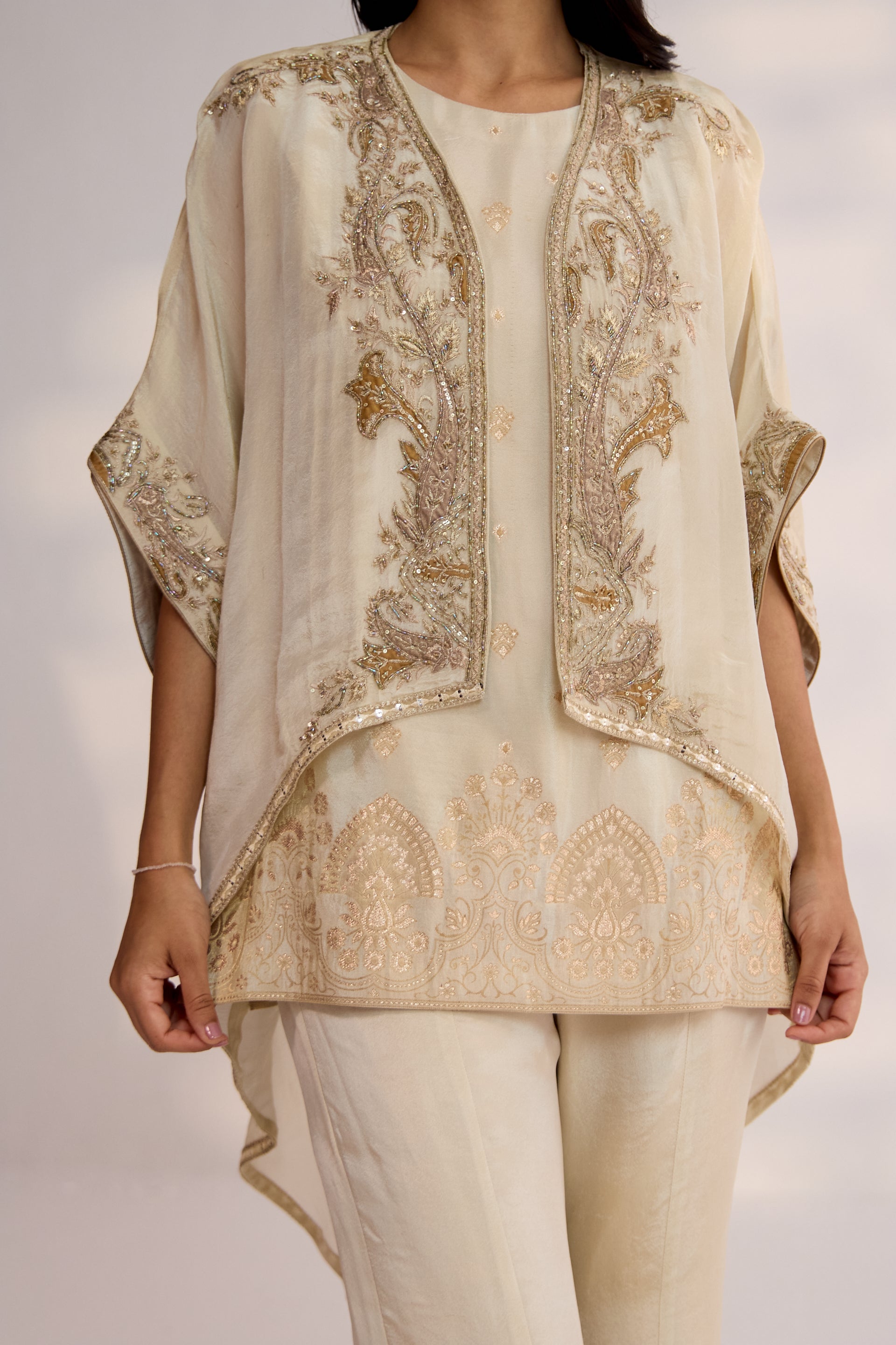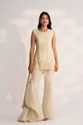 Crafted from luxurious shimmer tissue and adorned with intricate Banarsi tissue detailing, this Boot Cut Set offers a sophisticated look while ensuring comfort. The shimmering fabric adds a touch of glamour, making it a standout choice for festivities.