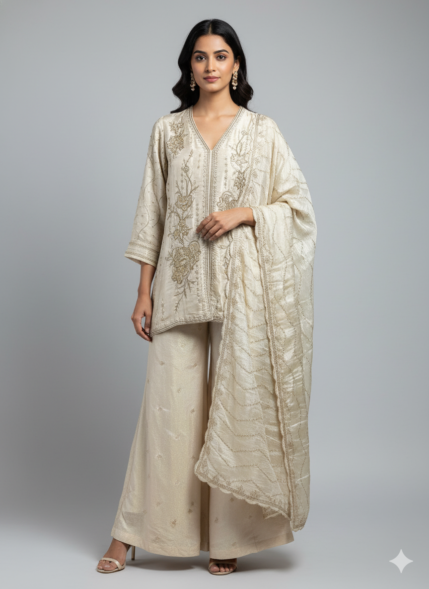 Elevate your style with the ethnic suit in tissue fabric, available in elegant shades of gold and mouve. Crafted from luxurious emb. tissue fabric, this set offers a smooth and lustrous finish that adds a touch of sophistication to any occasion. The sleek design ensures both comfort and style, making it perfect for festive events, semi-formal gatherings, or evening outings. The UV0558 heavy suit combines modern elegance with timeless beauty, offering you a refined and chic look for any special occasion.
